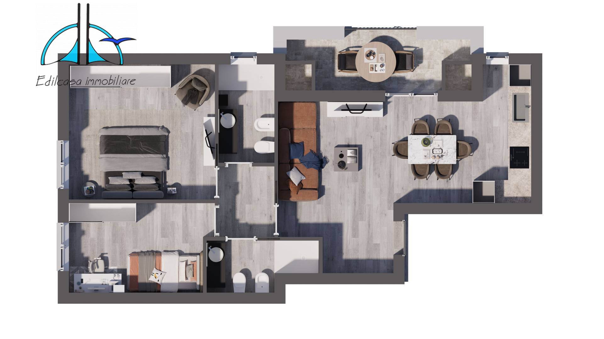 Al secondo piano troviamo TRILOCALE composto da: ingresso, salone con angolo cottura, camera, cameretta, disimpegno, 2 bagni e balcone di 20 mq.