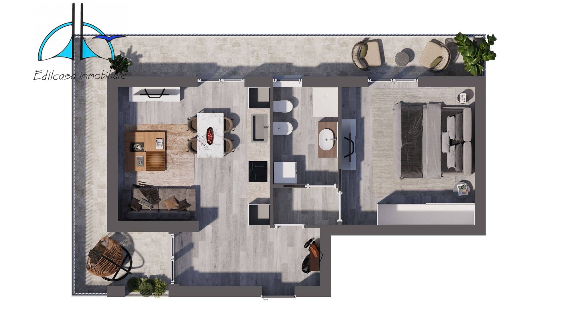 Al piano terra troviamo questo BILOCALE al piano terra composto da: salone con angolo cottura, camera, disimpegno, bagno, loggia, area pavimentata di 18 mq e giardino esclusivo di circa 40 mq.